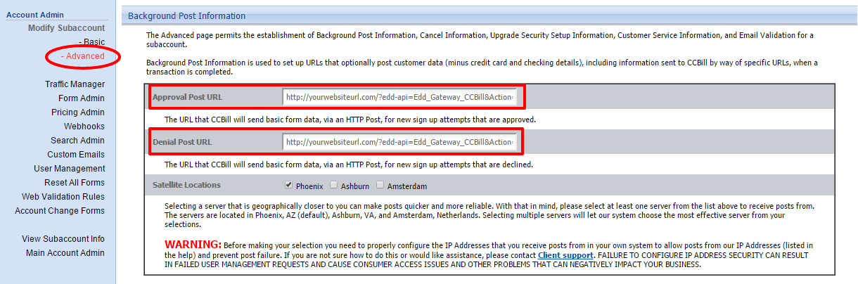 for enter both URLs in CCBill account go to - Advance menu available in Account Info->Sub Account Admin page left sidebar.