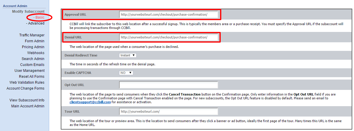 for entering both URLs in CCBill account go to - Basic menu available in Account Info->Sub Account Admin page left sidebar.