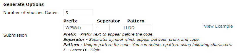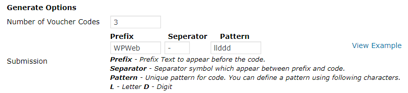 Example: If I enter Hello in to the voucher codes field and would then purchase a Voucher Code, the unique generated code would look like the following: WPWeb-Hello-1221 where 1221 would be the Order ID and would always be unique.