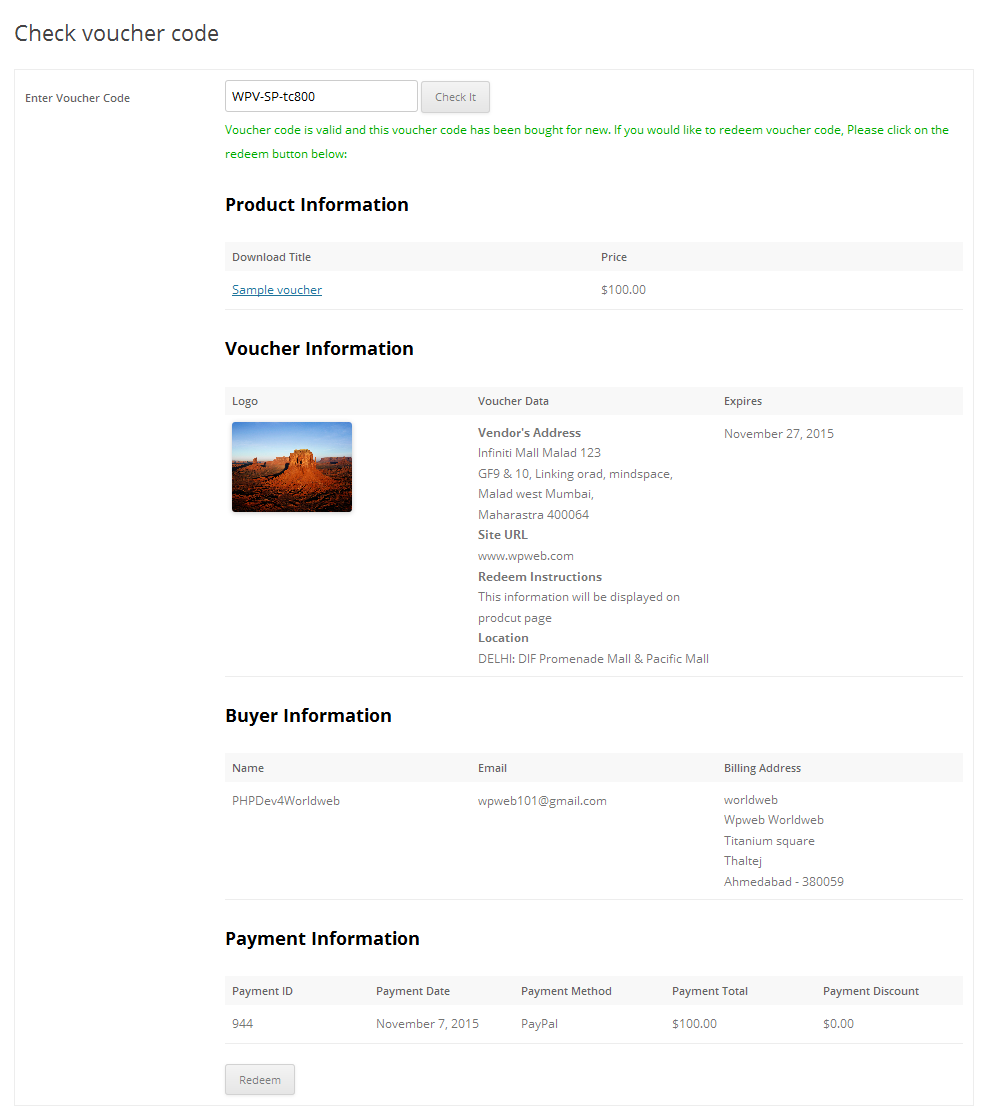 When you enter valid voucher code, it will display product information with option to redeem the voucher code as mentioned in the image below: