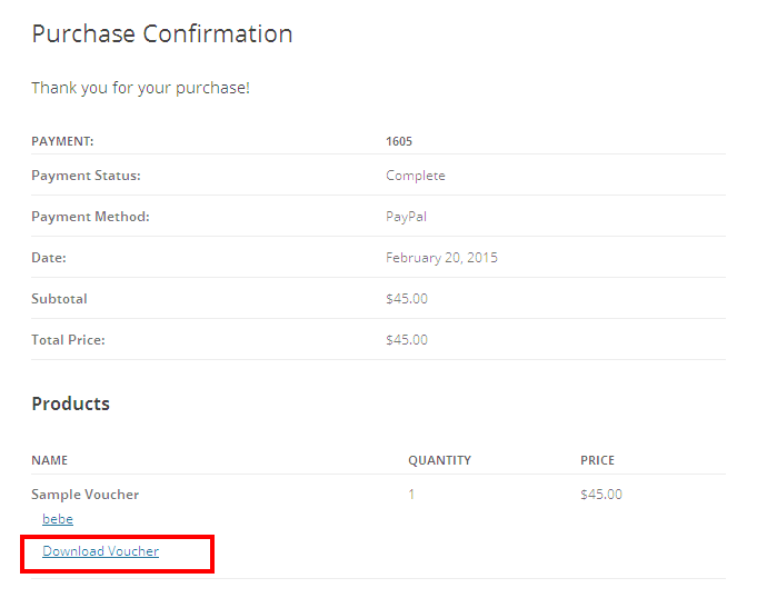 Once a voucher is generated, it will be attached and linked to from the standard customer order receipt emails, and available for download from the customer's My Account view order page, as well as the order Thank You page.