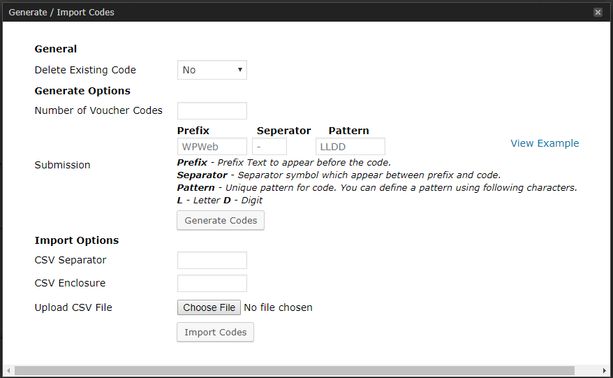 Here you can import a csv file with voucher codes or you can enter the prefix and pattern and extension will automatically create the voucher codes. When you click on the button "Generate / Import Codes" the popup would open which will look like as mentioned in image below :