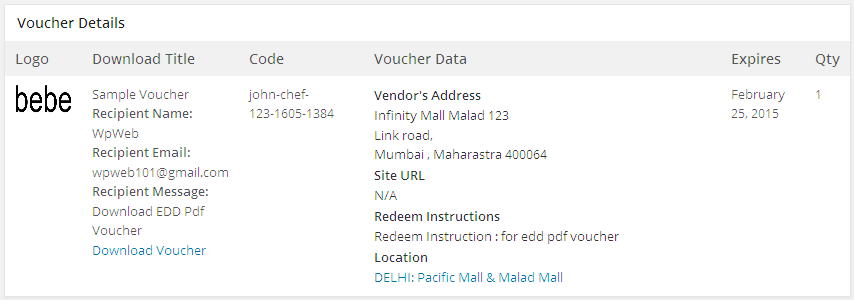 Once a voucher order is placed and access is granted to the voucher, you manage it like any other order, and according to your particular business procedures. File access can be viewed and managed as with any standard downloadable product. Additionally a new panel named Voucher Details will be added to the standard Easy Digital Downloads Order admin; for orders containing a product voucher the vendor logo, product title, voucher code, voucher data, expire date and quantity will be displayed:
