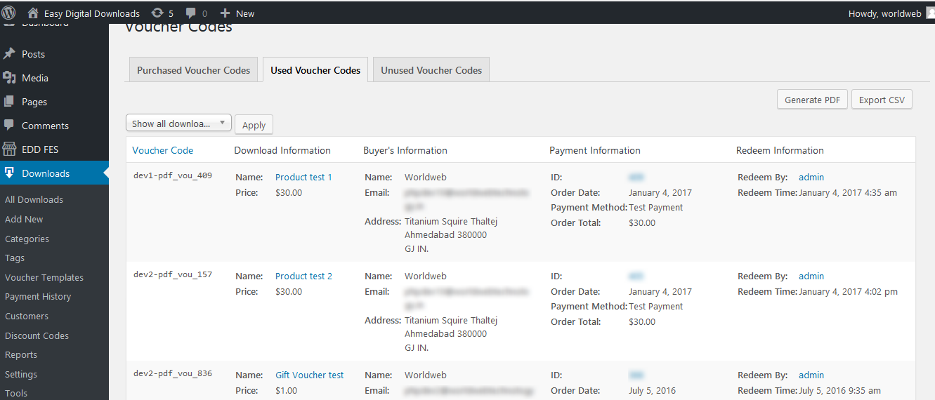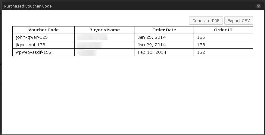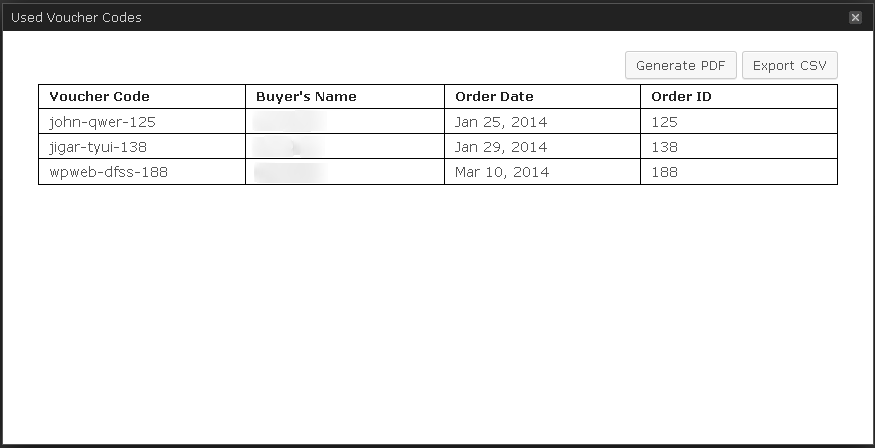Here you can see the list of all used voucher codes with the details like Download Information, Buyer's Information, Payment Information and Redeem Information. You can also export this data as CSV or PDF as well.