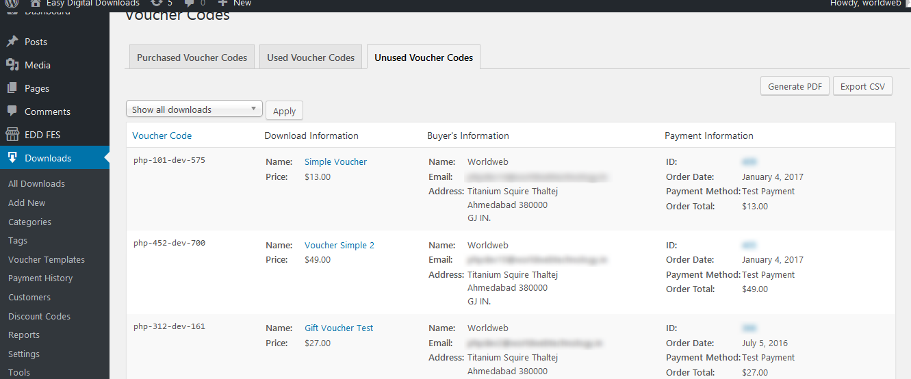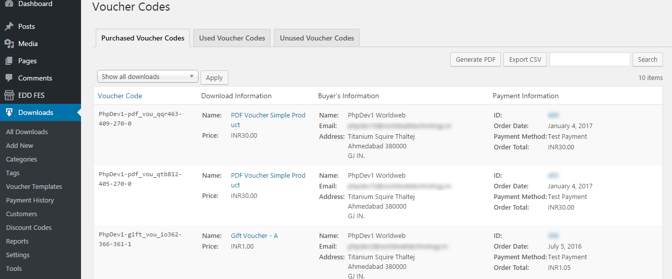Here you can see the list of all purchased voucher codes with the details like Download Information, Buyer's Information and Payment Information. You can also export this data as CSV or PDF as well.