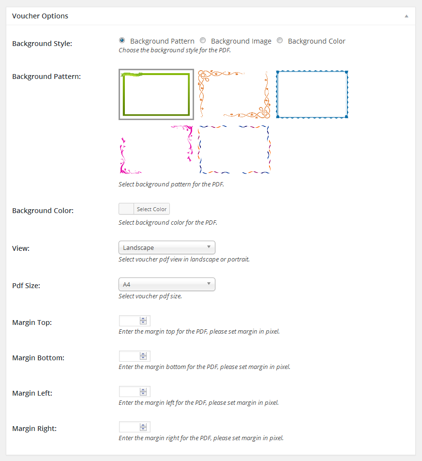 Choose the background style for the PDF Voucher like background pattern, background image or background color.