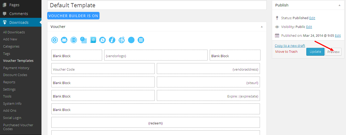 You can preview a voucher, complete with dummy data so you can easily see what your voucher PDF looks like before putting it up for sale. Note that you must save or update the voucher to see any changes in the voucher template Preview: