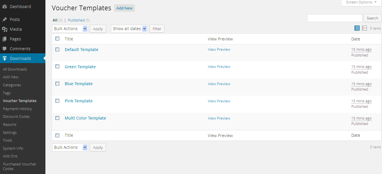 The plugin adds a new Admin menu found under the Easy Digital Downloads menu and named "Voucher Templates". From here, you can create as many voucher templates as you want with Drag & Drop interface. Plugin will automatically create 5 templates on plugin activation. Click this to see a list of voucher templates: