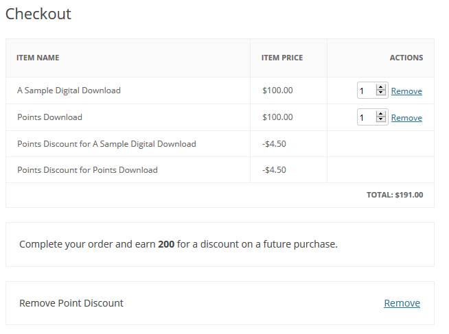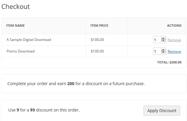 Easy Digital Downloads Points and Rewards extension allows you to reward your customers for purchases and other actions with points which can be redeemed for discounts. Easily set how many points customers will earn for each dollar spent and set how many points can be redeemed for a specific discount amount. Points can be set at the product or global level, and you can also control the maximum discount available when redeeming points.