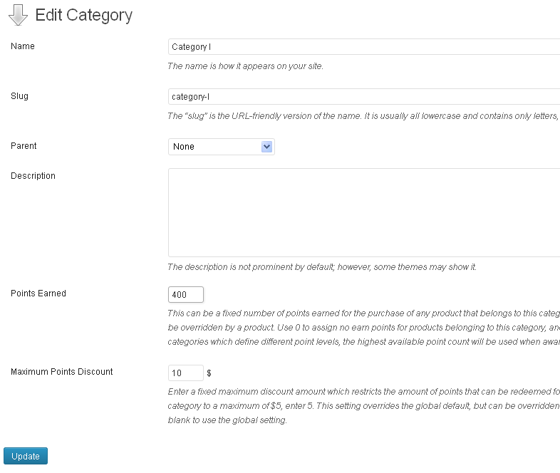 Allows you to limit the points discount that can be applied towards products belonging to this category. Set a fixed maximum discount dollar amount. For example, if you want to restrict the discount on this category to a maximum of $5, enter 5. This setting overrides the global default, but can be overridden by a product. Use 0 to disable point discounts for this category, and blank to use the global setting. If a product belongs to multiple categories which define different point discounts, the lowest point count will be used when allowing points discount for purchase.