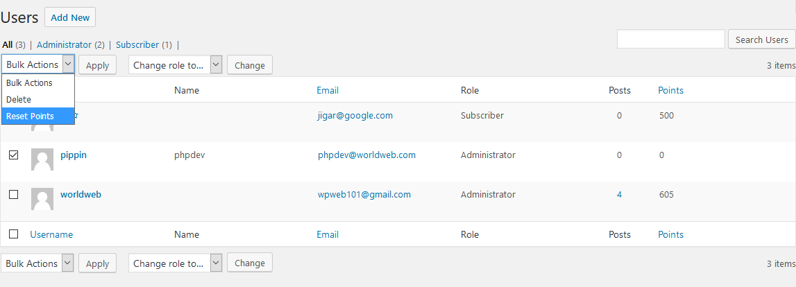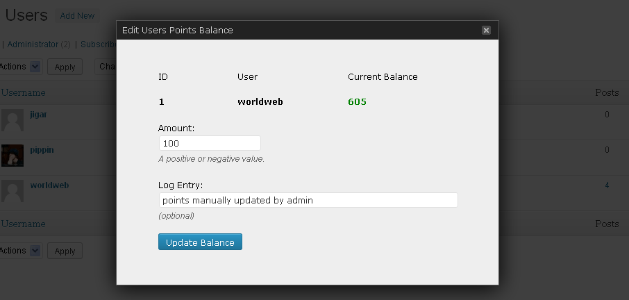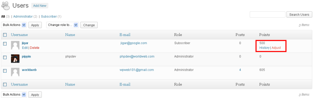 Simply hover your mouse over the user and click on "Adjust" in the Points column.To use the inline editor, simply hover your mouse over the user and in the "Points" column select "Adjust". You can make changes with or without a log entry.