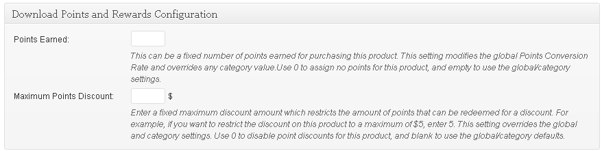 Allows you to modify the global Earn Points Conversion Ratio setting or override the category Points Earned setting by entering fixed number of points earned purchase of this product. This setting modifies the global Points Conversion Rate and overrides the category setting. Use 0 to assign no points for this product, and empty to use the global/category settings.