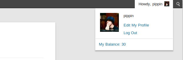 2. From the user's WordPress profile page. Hovering over your username in the WordPress toolbar will show your current balance: