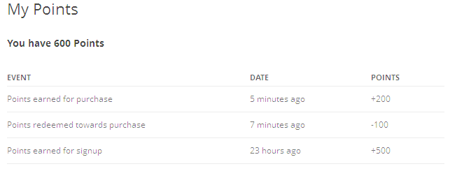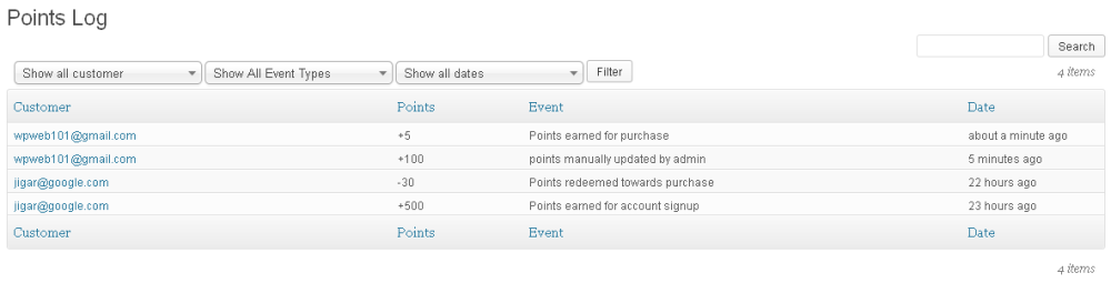 As shown above, for every point change event: the particular customer, the change in points, a description of the event, and a date for the event are displayed. The points log can be filtered by customers, event type and ordered by the change in points or event date, making it easy for you to determine exactly how points are being earned and redeemed in your store.