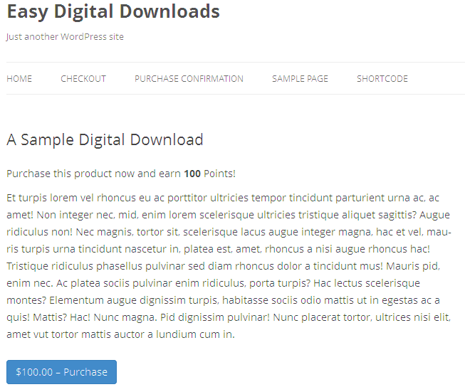 Add an optional message to the single product page below the price. Customize the message using {points} and {points_label}. Limited HTML is allowed. Leave blank to disable. Defaults to "Purchase this product now and earn <strong>{points}</strong> {points_label}!" which might look like "Purchase this product now and earn 100 points!".