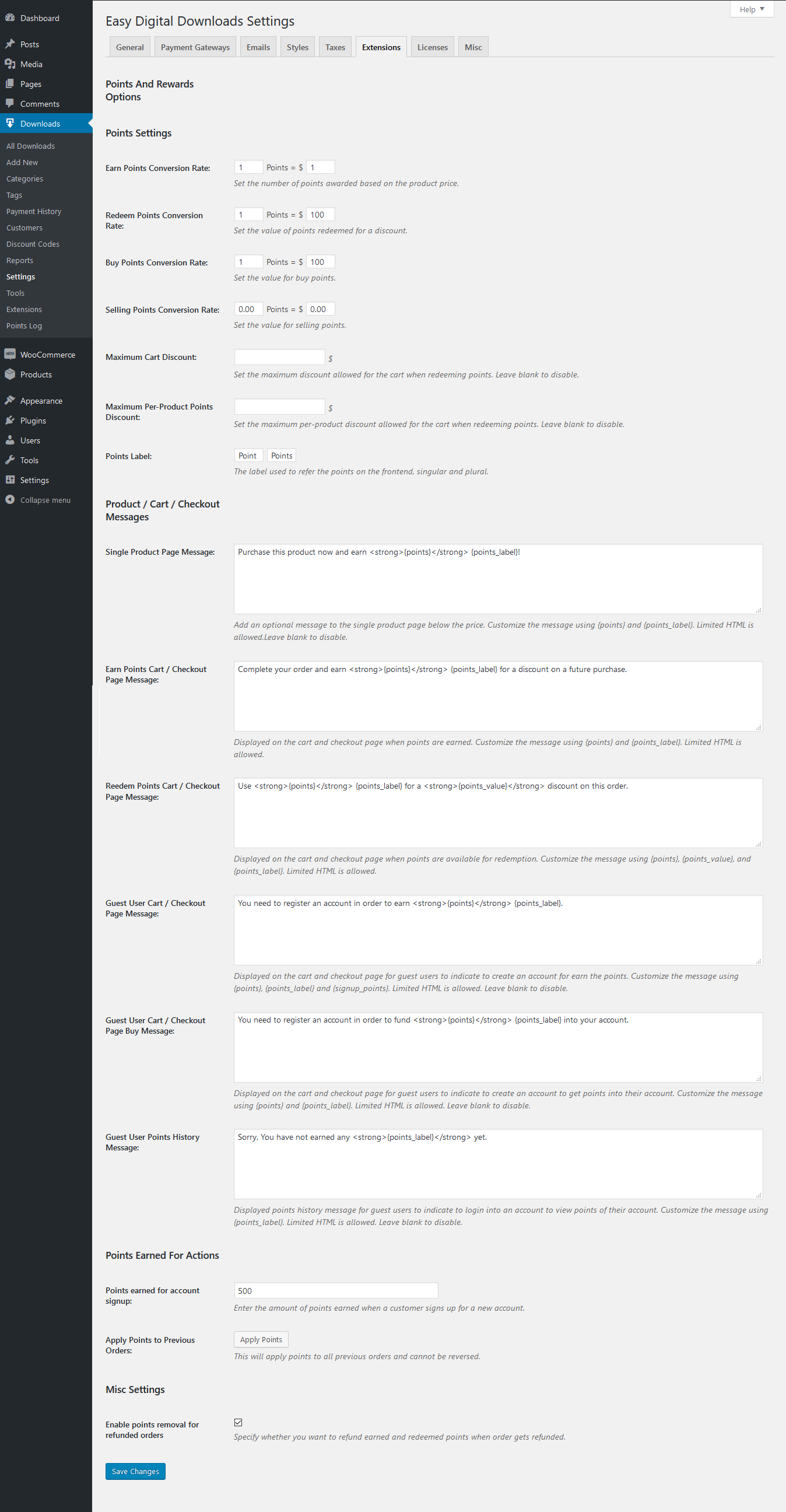 After installing the extension, a points and rewards section will be added to the Easy Digital Downloads Extensions tab.