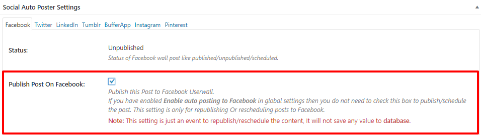 Once you add above code, you will see Publish Post On Facebook settings checked as shown in below screenshot: