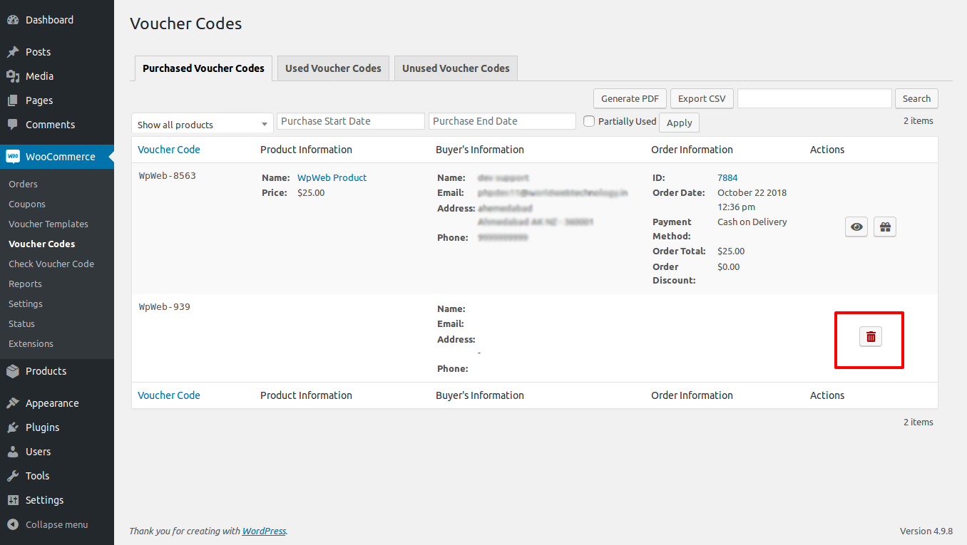 If PDF Vouchers plugin is deactivated and you delete WooCommerce orders then you will see Delete option to delete voucher codes manually as shown in below screenshot