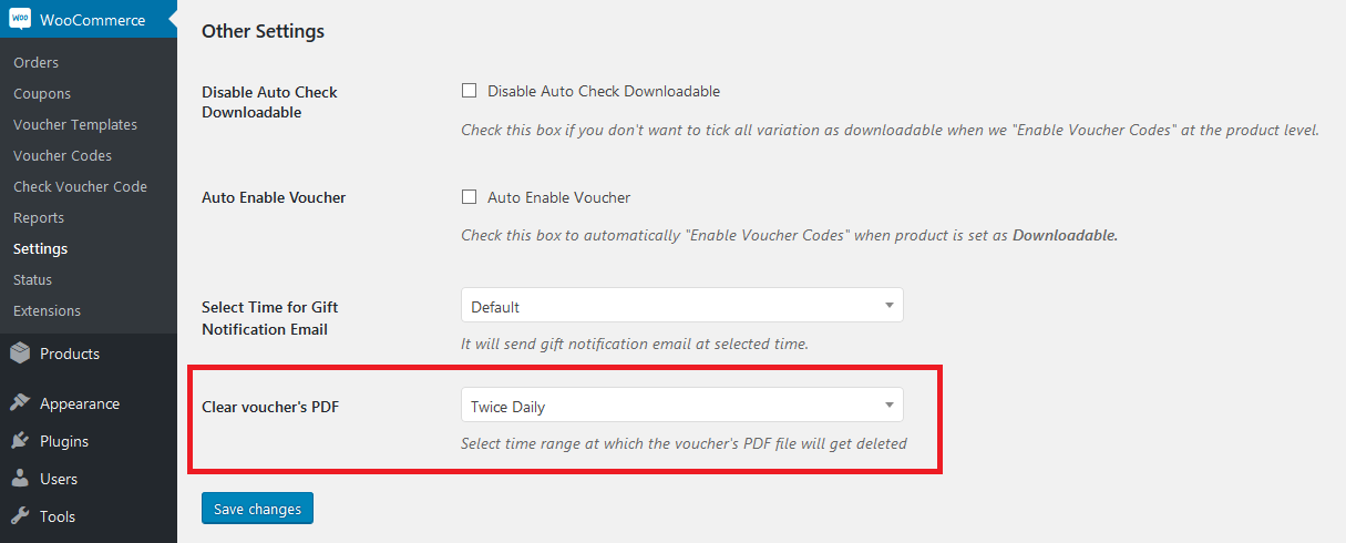 By default, plugin will delete all generated voucher's PDF twice daily. You can change it from WooCommerce -> Settings -> PDF Vouchers -> Misc Settings as shown in below screenshot.