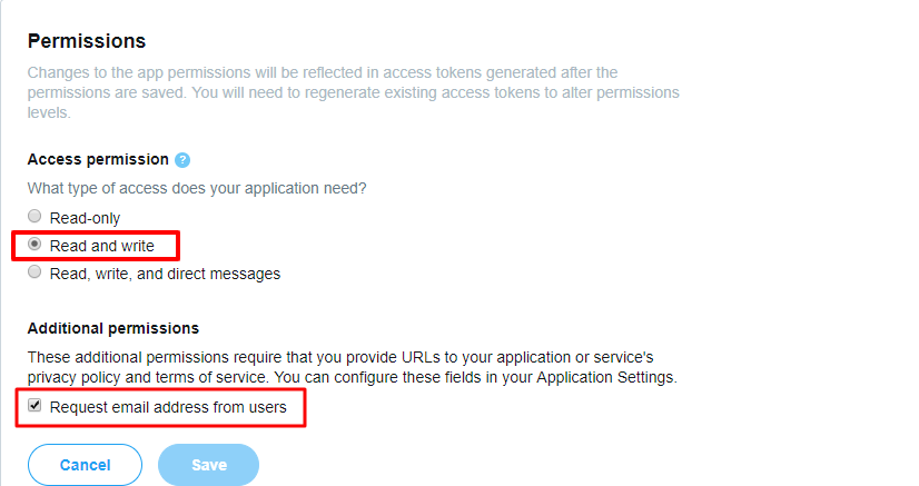 To get users email you need to enter Terms of Service URL and Privacy policy URL and tick Request email address from users option in a Twitter App that you have created. Please check the screenshot below.