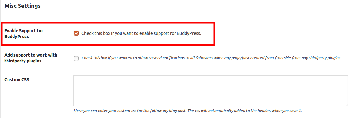 If BuddyPress plugin is activated, you will see below setting under Follow My Blog Post -> Settings -> General.