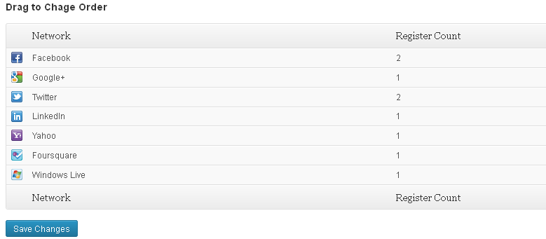 Admin can change the order of social networks buttons by drag and drop interface and view number of sign-ups for each social network as shown in the image below.
