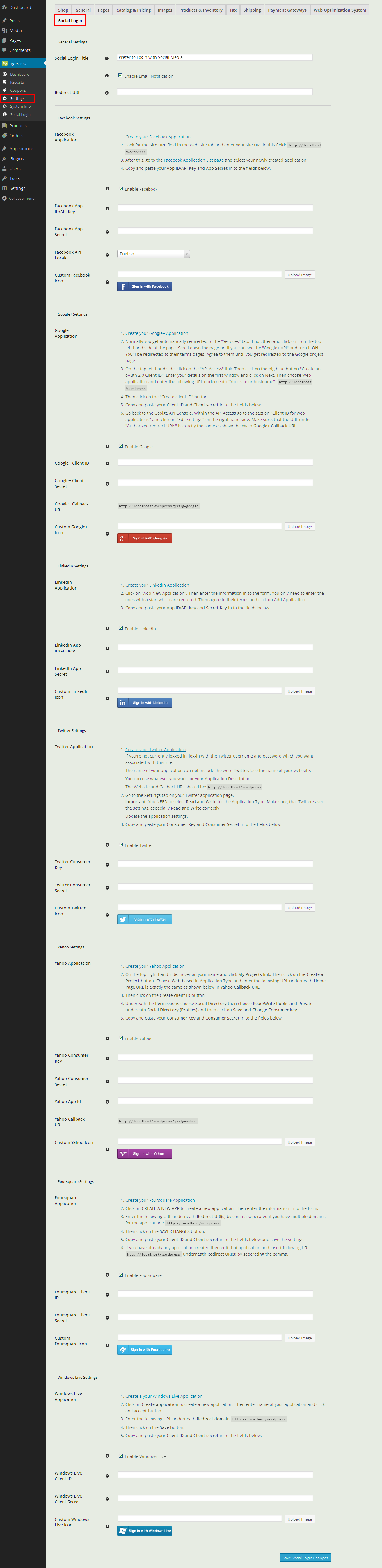 After installing the extension, a Social Login tab will be added to the Jigoshop settings. Click the tab to configure the plugin.