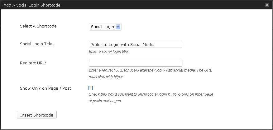 Click on the social login icon and a new window with the custom settings will pop up as shown in the image below.