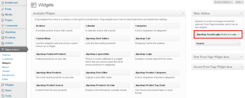 Find the "Jigoshop: Social Login" widget and drag it to your desired place. You can title your widget (this will appear above the social buttons).