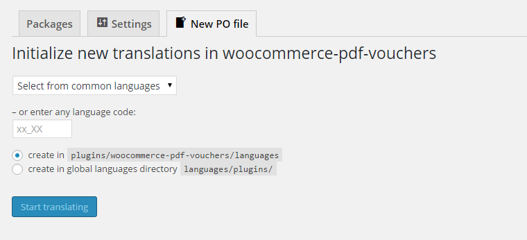 Then choose the language to add in the list, or enter the language ISO code (ex: fr_FR, en_US etc...), and select the folder to add the translation files to, and hit Start Translating: