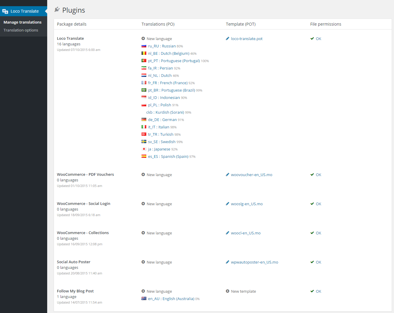 Once you installed and activated Loco Translate, a new "Loco Translate" menu item is created with two sub-sections. By default the "Manage Translations" section will list all your themes and plugins and will display all available translations for each of them: