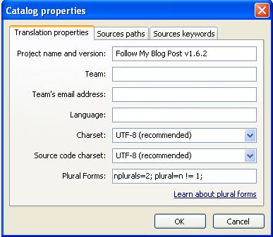 To get started open PoEdit and go to File > New catalog from POT file. Once you have done this, choose plugin-textdomain-en_US.po file and PoEdit will show the catalog properties window: