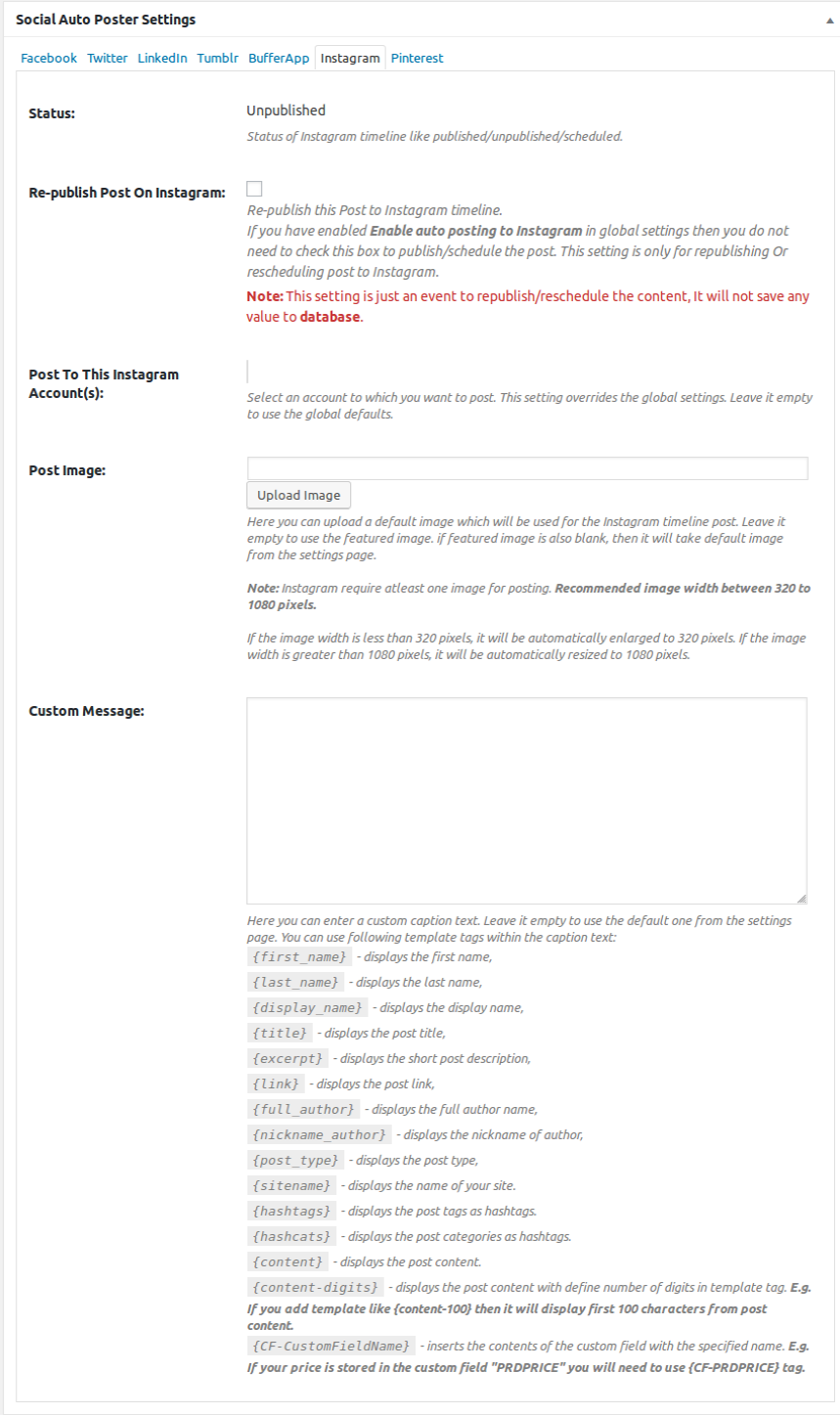 {first_name} - displays the first name{last_name} - displays the last name{display_name} - displays the display name{title} - displays the post title{excerpt} - displays the short post description{link} - displays the post link{full_author} - displays the full author name{nickname_author} - displays the nickname of author{post_type} - displays the post type{sitename} - displays the name of your site{hashtags} - displays the post tags as hashtags{hashcats} - displays the post categories as hashtags{content} - displays the post content{content-digits} - displays the post content with define number of digits in template tag. E.g. If you add template like {content-100} then it will display first 100 characters from post content{CF-CustomFieldName} - inserts the contents of the custom field with the specified name. E.g. If your price is stored in the custom field "PRDPRICE" you will need to use {CF-PRDPRICE} tag.