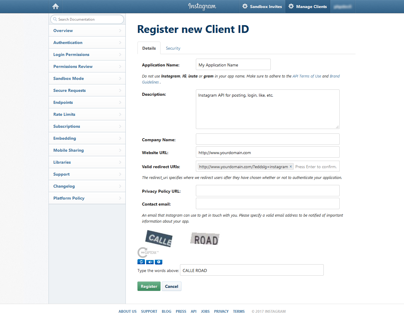 Note: When you enter the URL of your website in to the Website and OAuth redirect_uri fields, make sure that it does match the URL of your website 100%. This means, if you go to your website and then check the URL in the browser and the URL does look like http://www.domain.com then you need to enter the exact same URL. If your website URL is http://domain.com then you need to enter it that way, without using the www at the front of the name.