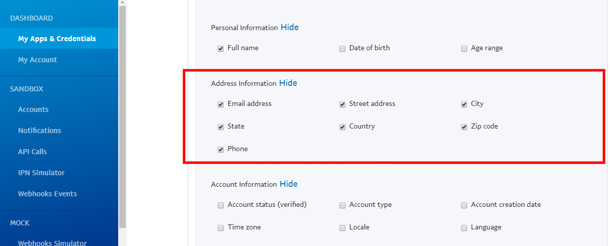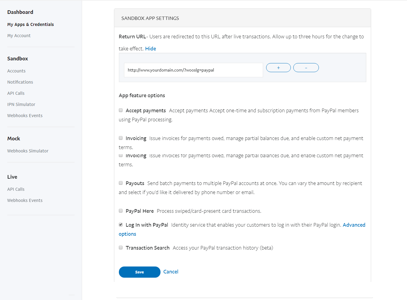 Underneath the "App feature options" First, uncheck "Accept Payments", "Invoicing", "Payouts" and keep only "Log In with PayPal" as checked.