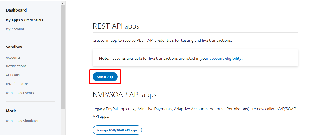 You need to be logged in to your PayPal account to be able to access their developer page. So first, login to your PayPal account and then follow the link above to get to their developer page. This should look similar to the one shown in the image below: