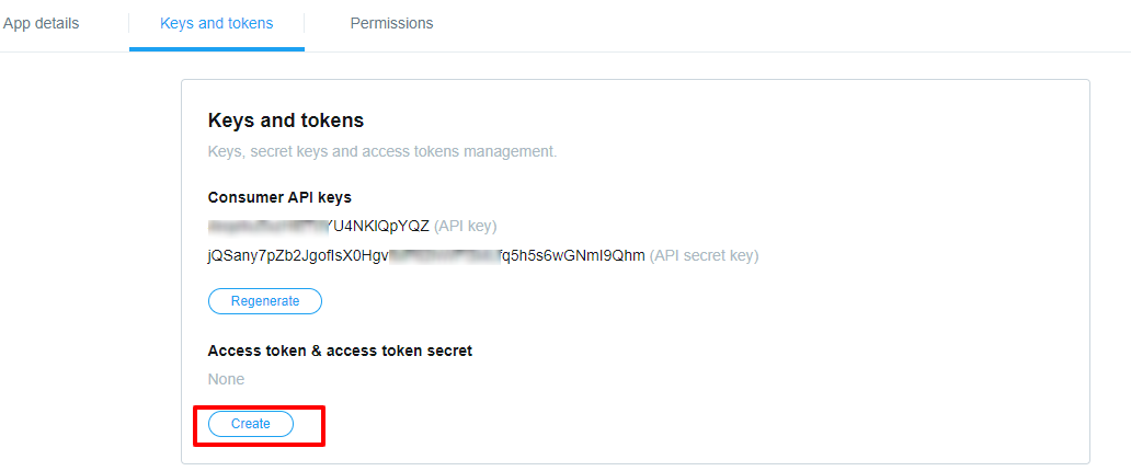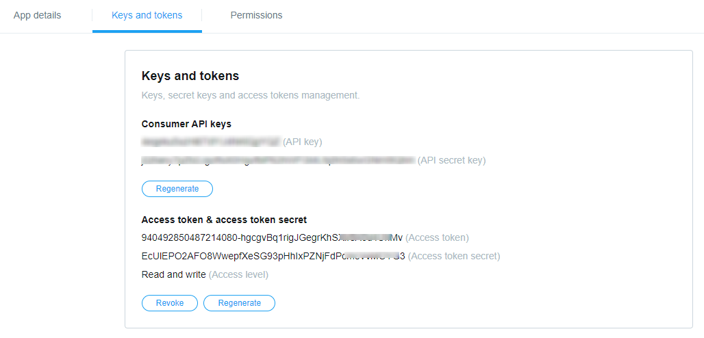 This will create the access tokens for your Twitter app. After it has been created you should see them above the button, as shown in the image below:
