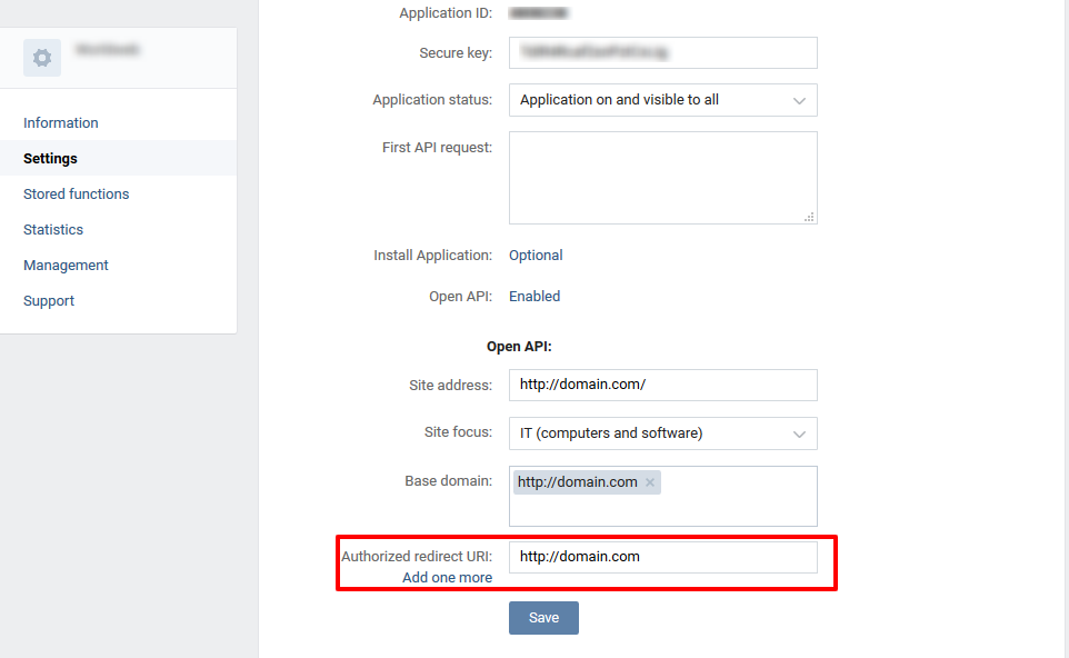 Copy the Application ID and Secure key in to the VK.com App settings within the Plugin settings page. See image below: