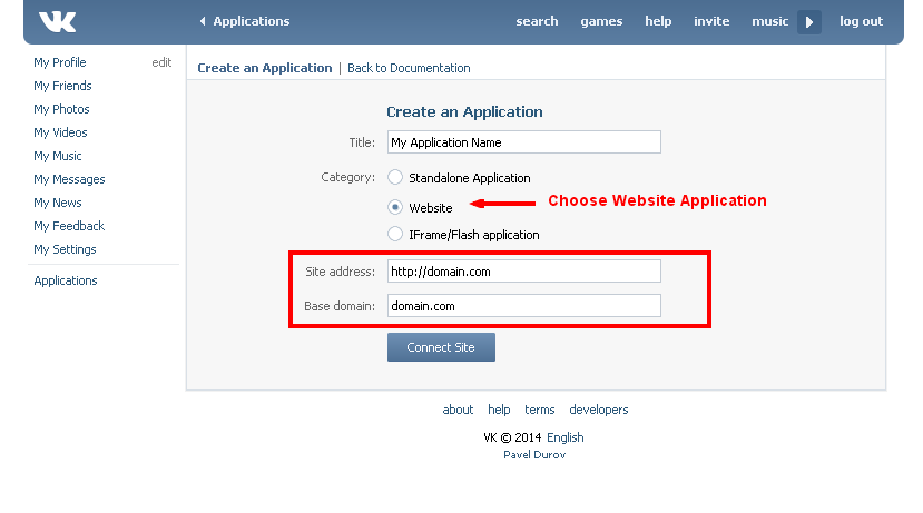 Note: Your account needs to be a verified VK.com account. If your account isn't verified yet, you'll receive a text message from VK.com to verify your account. So make sure, that you have a mobile number set within your account, otherwise you won't be able to create an App. On VK.com apps page, click on "Create An Application" button on the top right hand side. A new page will be open (see image below). Enter a Title for your new app, choose an App Category as "Website", Enter Site address and Base domain and click on Connect site.