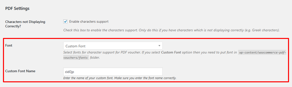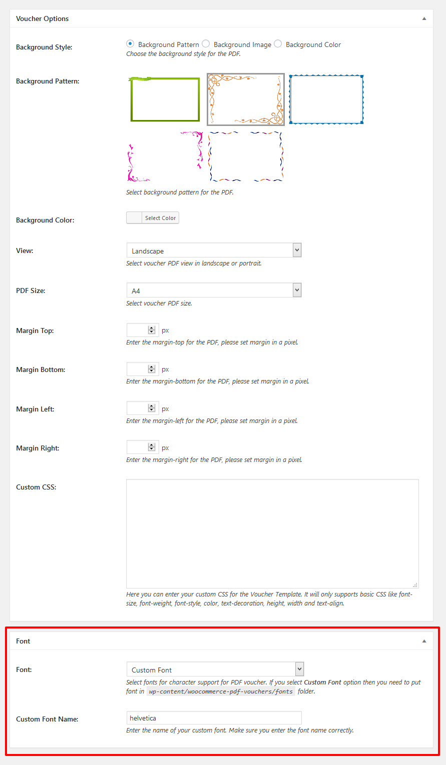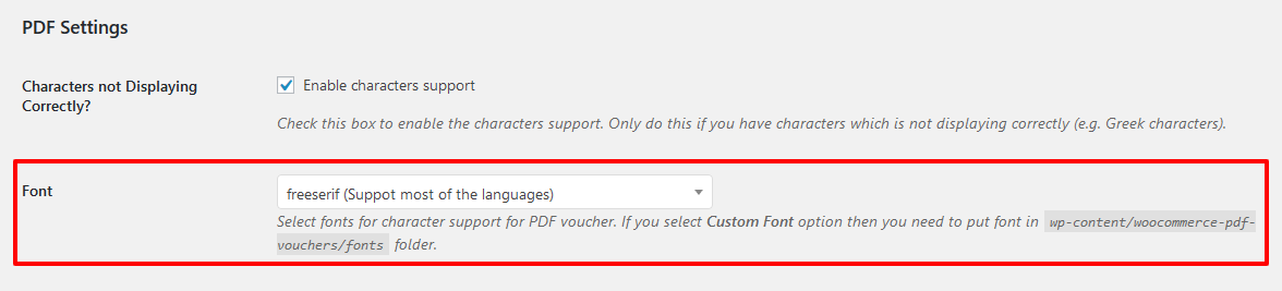 If you do not find your font name from the all the available fonts above, please select Custom Font option from the dropdown. You will be able to see a textbox where you can enter the name of your custom font. You need to put your custom font in wp-content/woocommerce-pdf-vouchers/fonts folder.