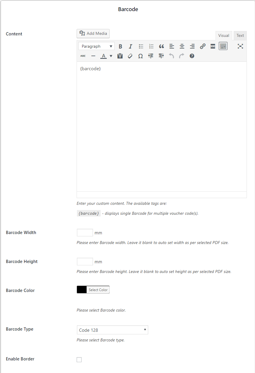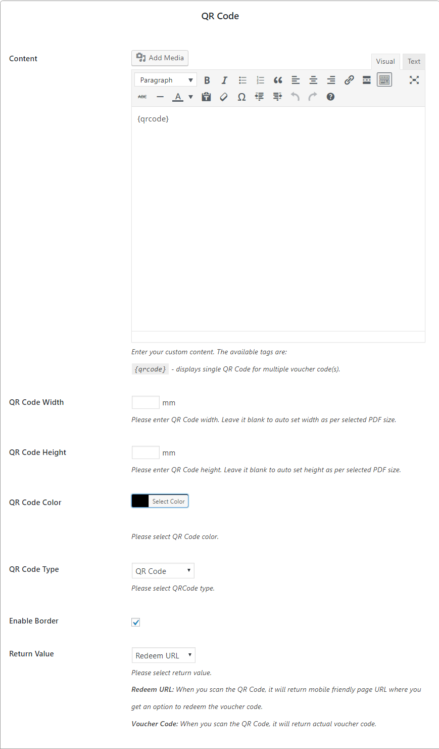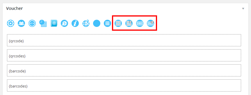 You can create QRcode/Barcode for your voucher codes and easily add them to pdf file. We have created 4 shortcodes for that, which you can find when you add/edit any voucher template as mentioned in the image below: