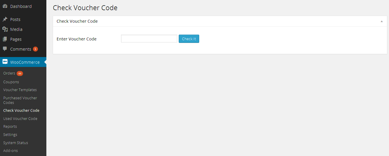 To integrate the "Check Voucher Code" Page on frontend into any page or post you can use the [woo_vou_check_code] shortcode. After inserted shortcode it will look something like the one shown in the image below on frontend:
