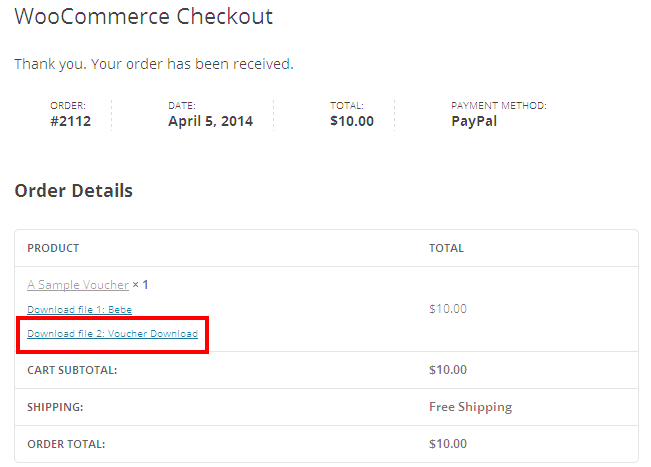 Once a voucher is generated, it will be attached and linked to from the standard customer order receipt emails, and available for download from the customer's My Account view order page, as well as the order Thank You page.