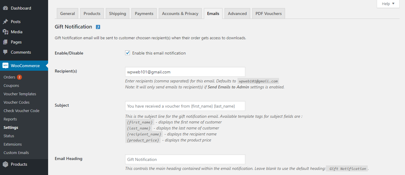 If the optional "Recipient Email" field is enabled, a separate email will also be sent to the email address supplied by the customer, and is perfect for vouchers that can be sent as gifts. This will be sent at the same time as the customer email, so vouchers are only sent to recipients for processing or completed orders (depending on your settings).