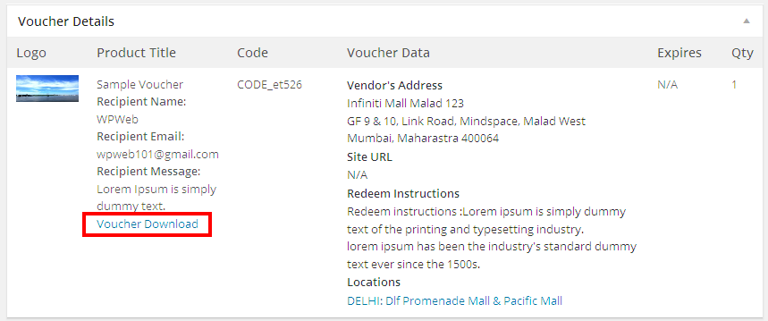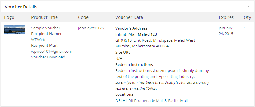 Once a voucher order is placed and access is granted to the voucher, you manage it like any other order, and according to your particular business procedures. File access can be viewed and managed as with any standard downloadable product. Additionally a new panel named Voucher Details will be added to the standard WooCommerce Order admin; for orders containing a product voucher the vendor logo, product title, voucher code, voucher data, expire date and quantity will be displayed: