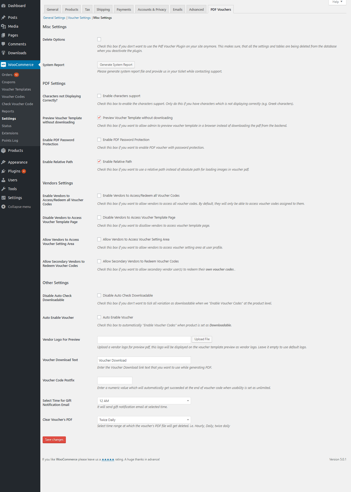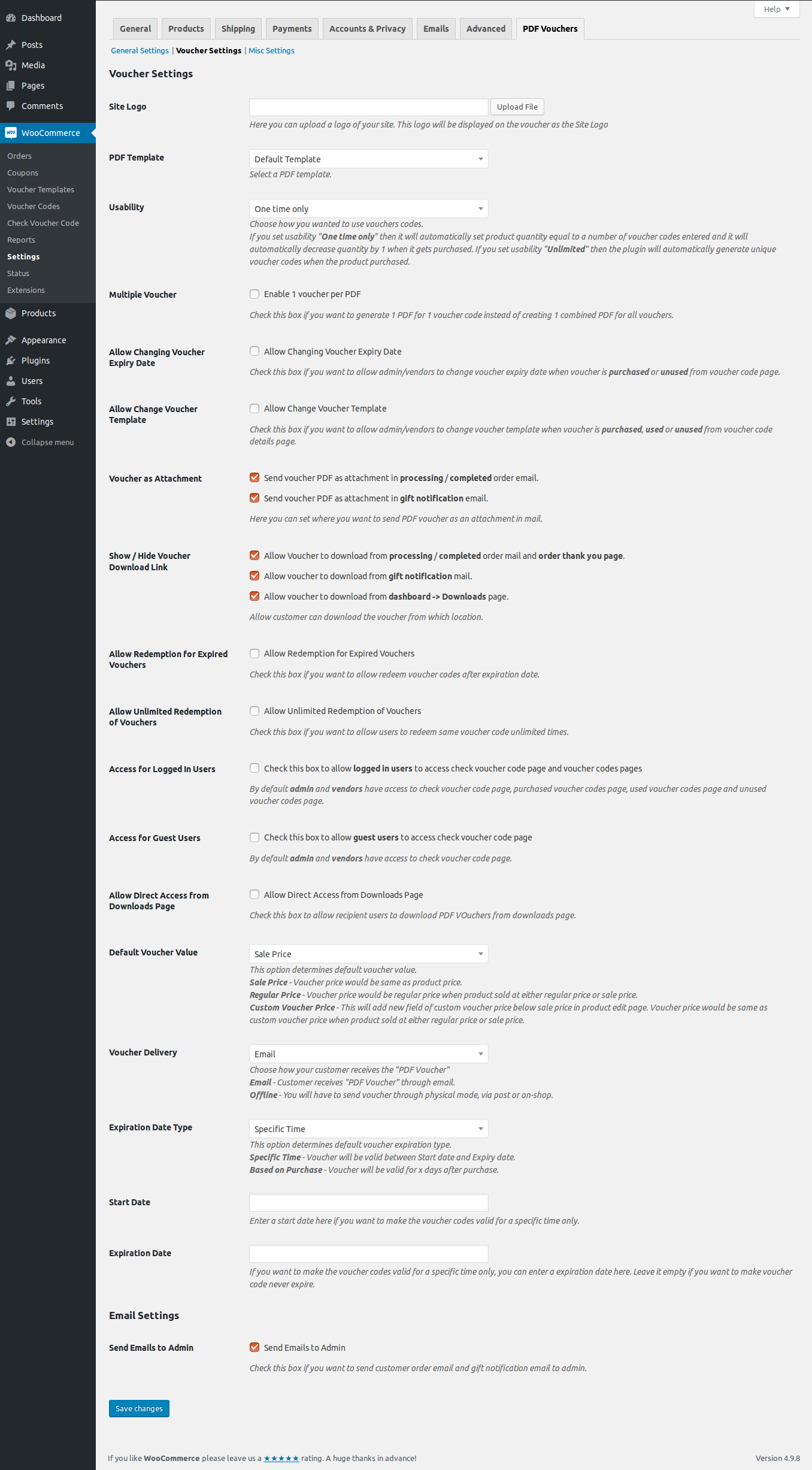 After installing the extension, a Voucher section will be added to the WooCommerce settings page.
