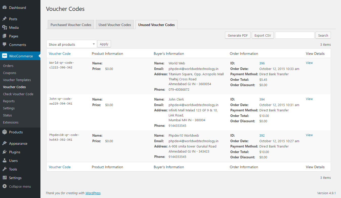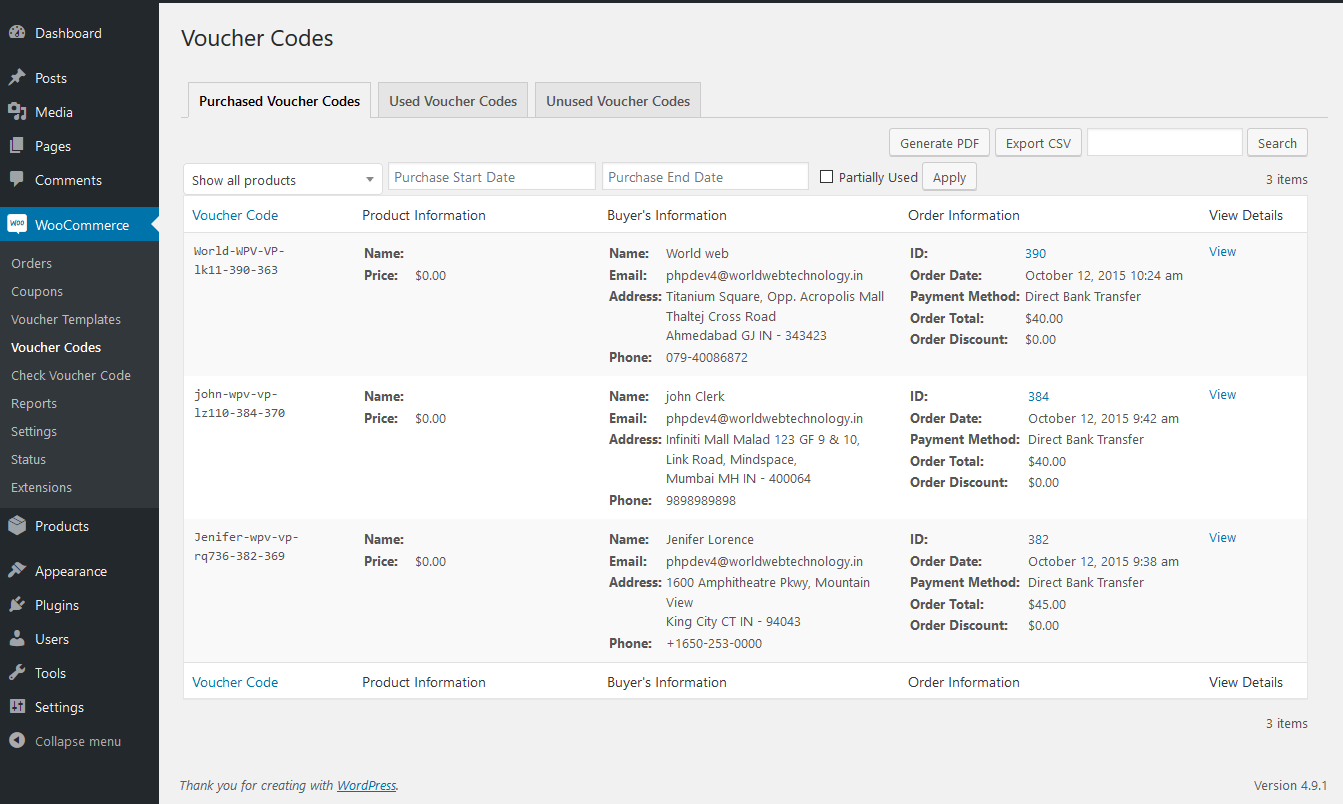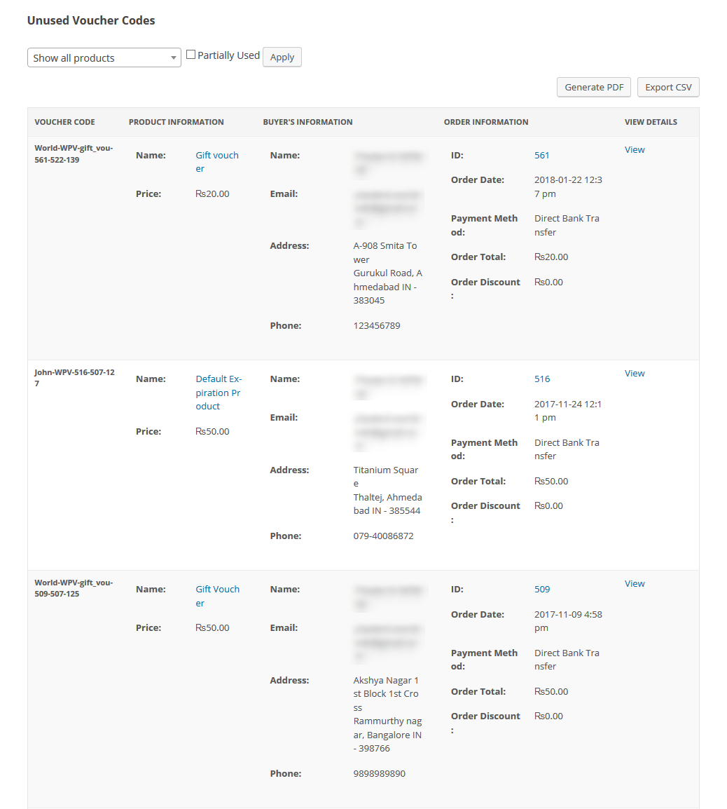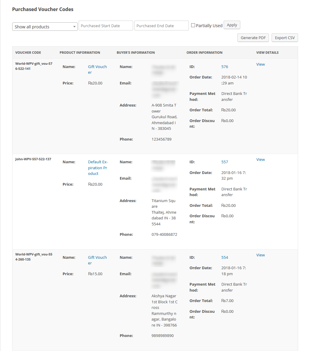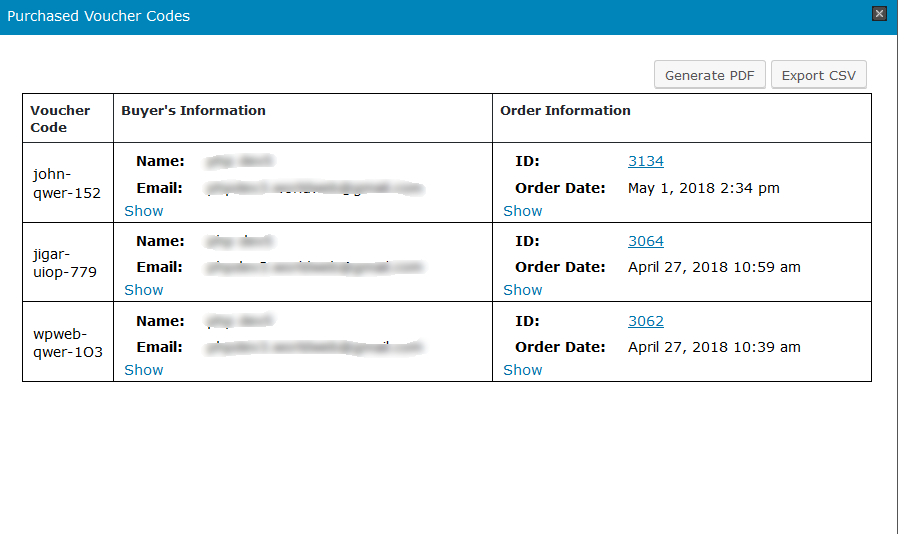 Here you can see the list of all purchased voucher products and with the details of purchased voucher codes, Product's Information, Buyer's Information, Order's Information. You can also export this data as CSV or PDF as well.