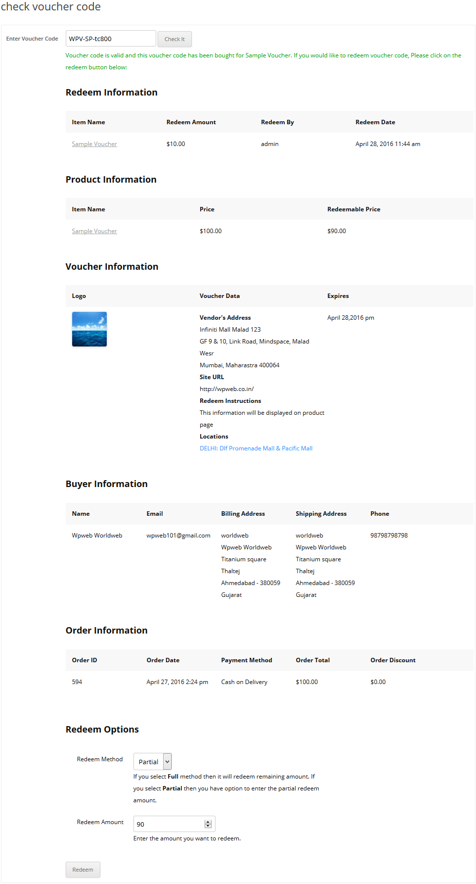 When you enter valid voucher code, it will display product information, partial redeem information, voucher information, buyer information, order information with option to redeem the voucher code Partial or Full as mentioned in the image below: