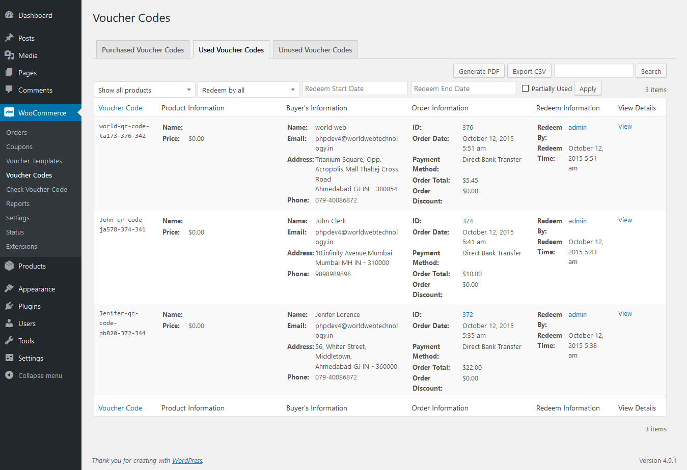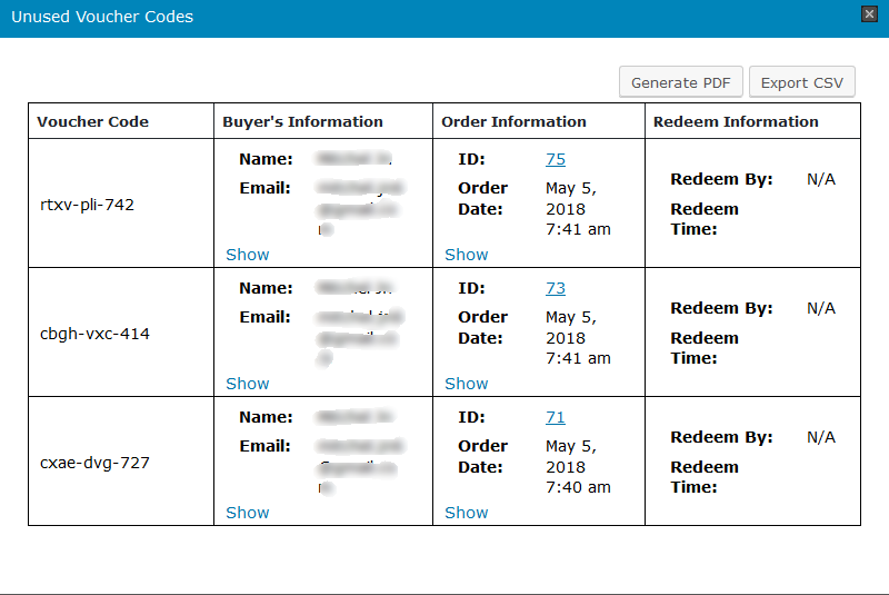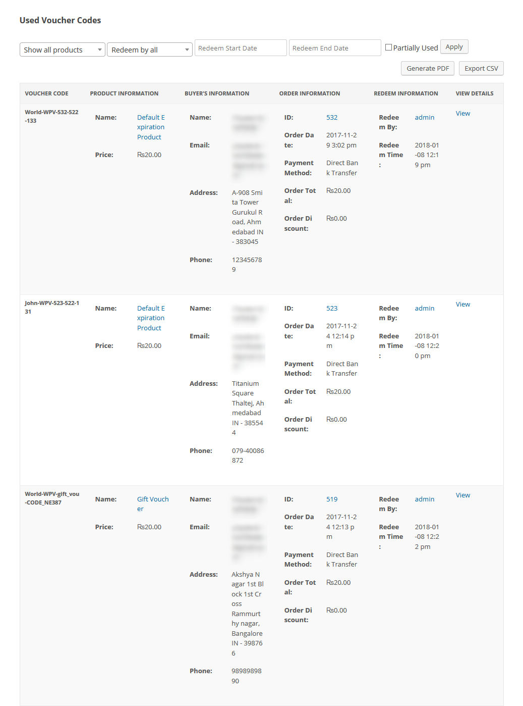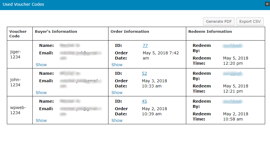 Here you can see the list of all used voucher products and with the details of used voucher codes, Product's Information, Buyer's Information, Order's Information and Redeem By. You can also export this data as CSV or PDF as well.