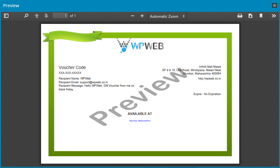 By clicking on "Preview", a popup will be displayed where users can see how their gift voucher will look like, as shown below :-